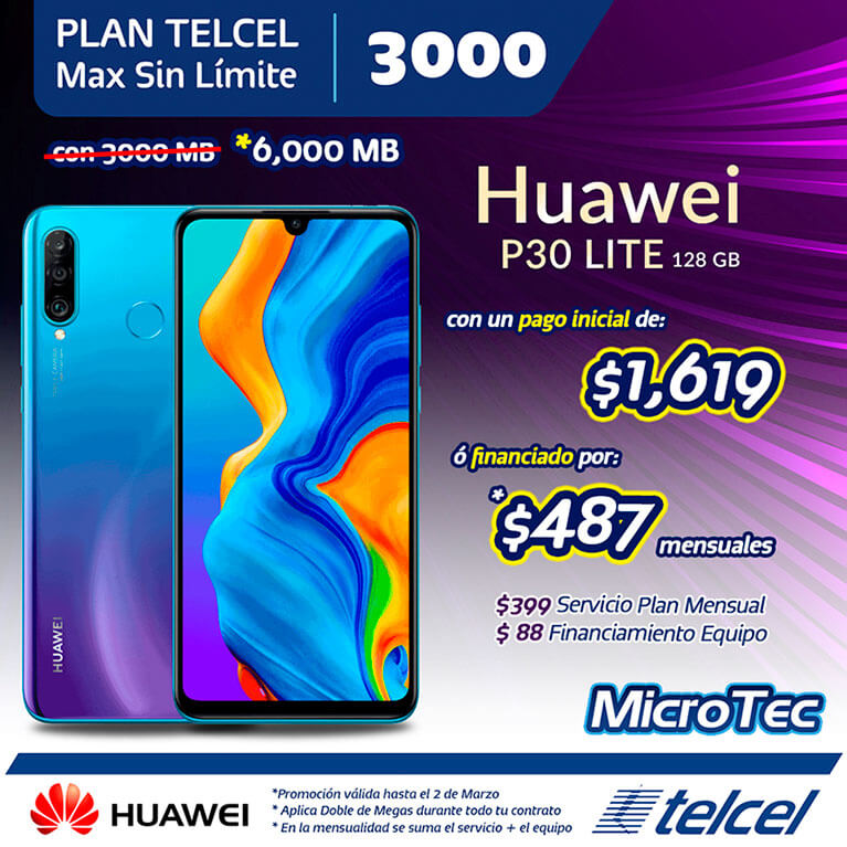 Ven a Microtec y estrena un padrísimo Huawei P30 Lite de 128 GB, al contratar o renovar un Plan Telcel Max Sin Límite 3000 de $300 pesos mensuales; con un pago inicial de $1,619.00 o bien financiado con tu plan por $487 al mes a 24 meses.