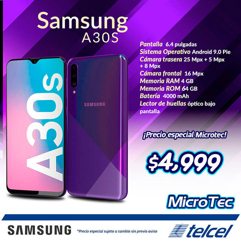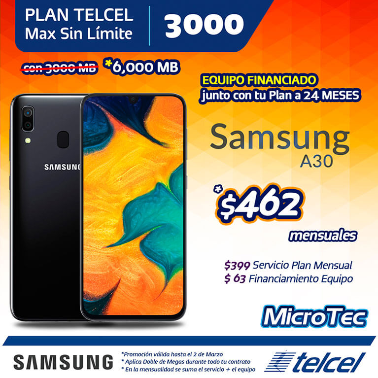 Ven a Microtec y llévate tu nuevo Samsung A30 al contratar o renovar tu Plan Telcel Max Sin Límite 3000, con una mensualidad de sólo: $462.00 pesos mensuales.