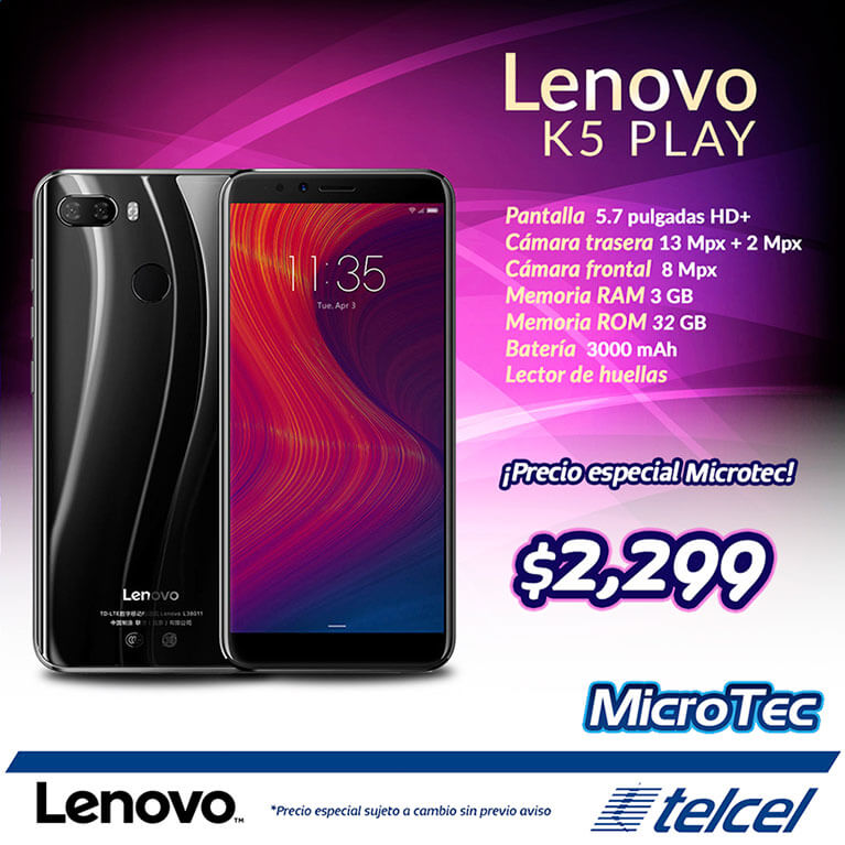 El Lenovo K5 Play es un smartphone Android con pantalla HD+ de 5.7 pulgadas, procesador Snapdragon 430 con 2GB de RAM y 16GB de almacenamiento o 3GB de RAM y 32GB de almacenamiento, cámara dual de 13 MP + 2 MP, lector de huellas y batería de 3000 mAh.